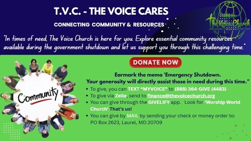 The Voice Church (TVC) recognizes that many individuals and families have been deeply affected by the ongoing government shutdown, and our hearts go out to those experiencing hardship during this time. In an effort to provide practical assistance and encouragement, we have compiled a list of trusted community and government resources designed to help those who have been furloughed or financially impacted. These resources include information on food assistance, financial aid, mental health support, and other essential services that can offer relief and stability as you navigate these uncertain days.